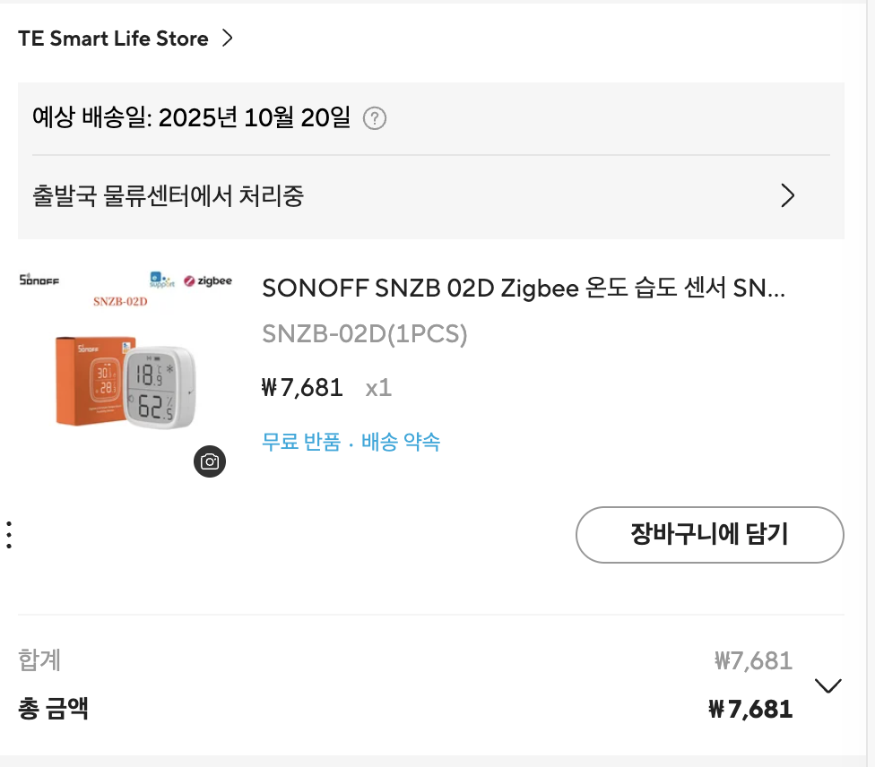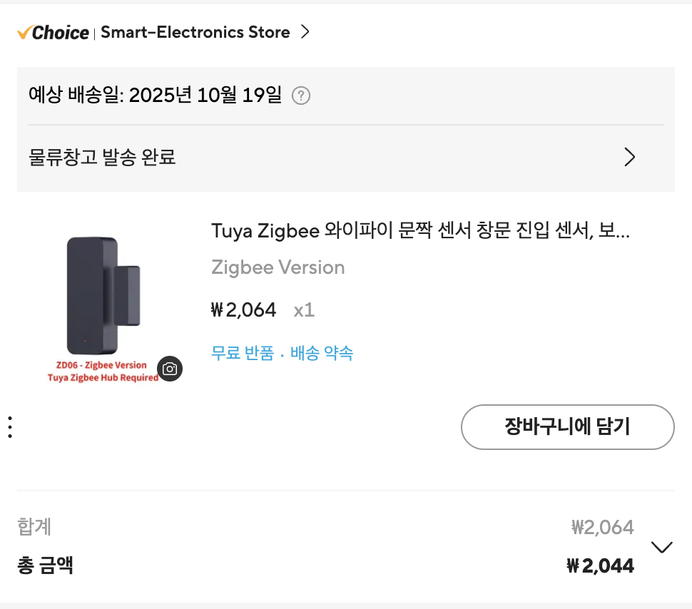 그때 마침 문열림 센서가 눈에 들어왔고, 신규 계정 쿠폰의 유혹을 이기지 못하고 문열림 센서인 Tuya ZD06 제품도 함께 충동적으로 장바구니에 담아버렸다.